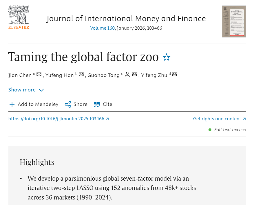 近日,金融与统计学院金融科技与工程系唐国豪副教授合作的金融人工智能领域类论文“Taming the Global Factor Zoo”发表在《Journal of International Money and Finance》2026年第1期上。