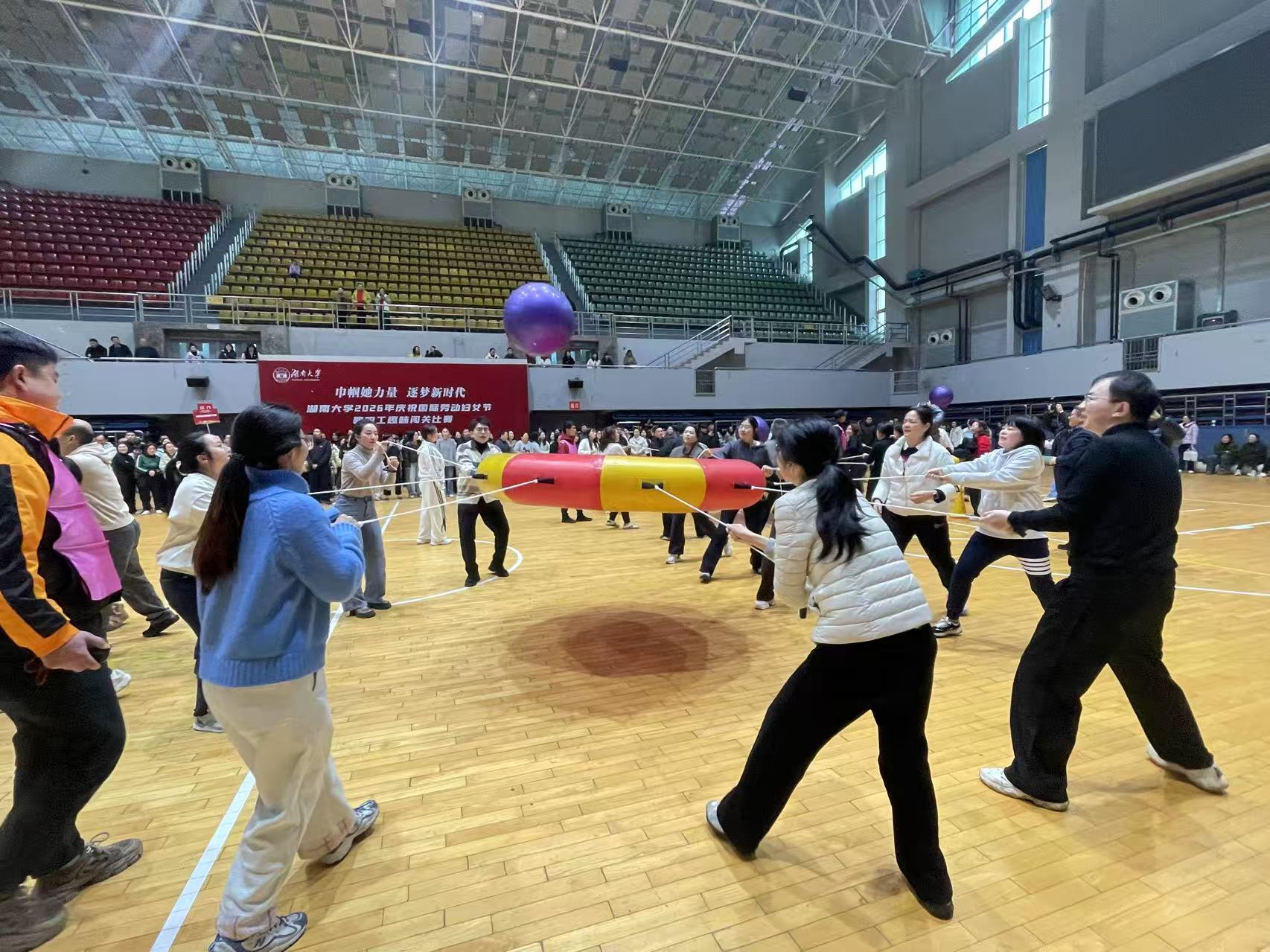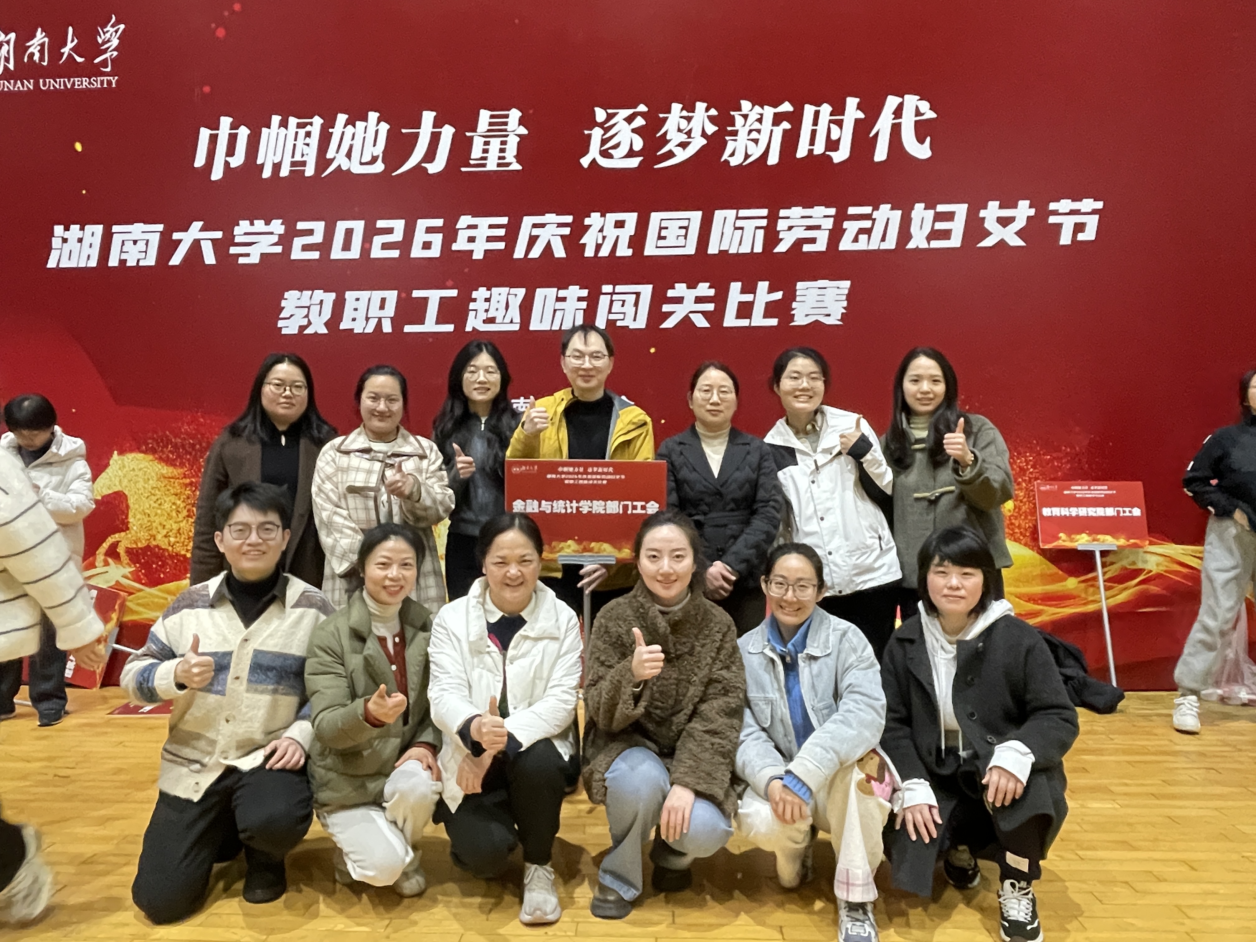 3月3日下午,湖南大学工会举办“2026年庆祝国际劳动妇女节教职工趣味闯关比赛”。金融与统计学院积极响应,十余名教职工组成参赛队伍,以饱满的热情投入其中。大家默契配合、奋勇争先,在趣味运动间展现蓬勃朝气与团结风采,在欢声笑语中传递节日的喜悦与活力。