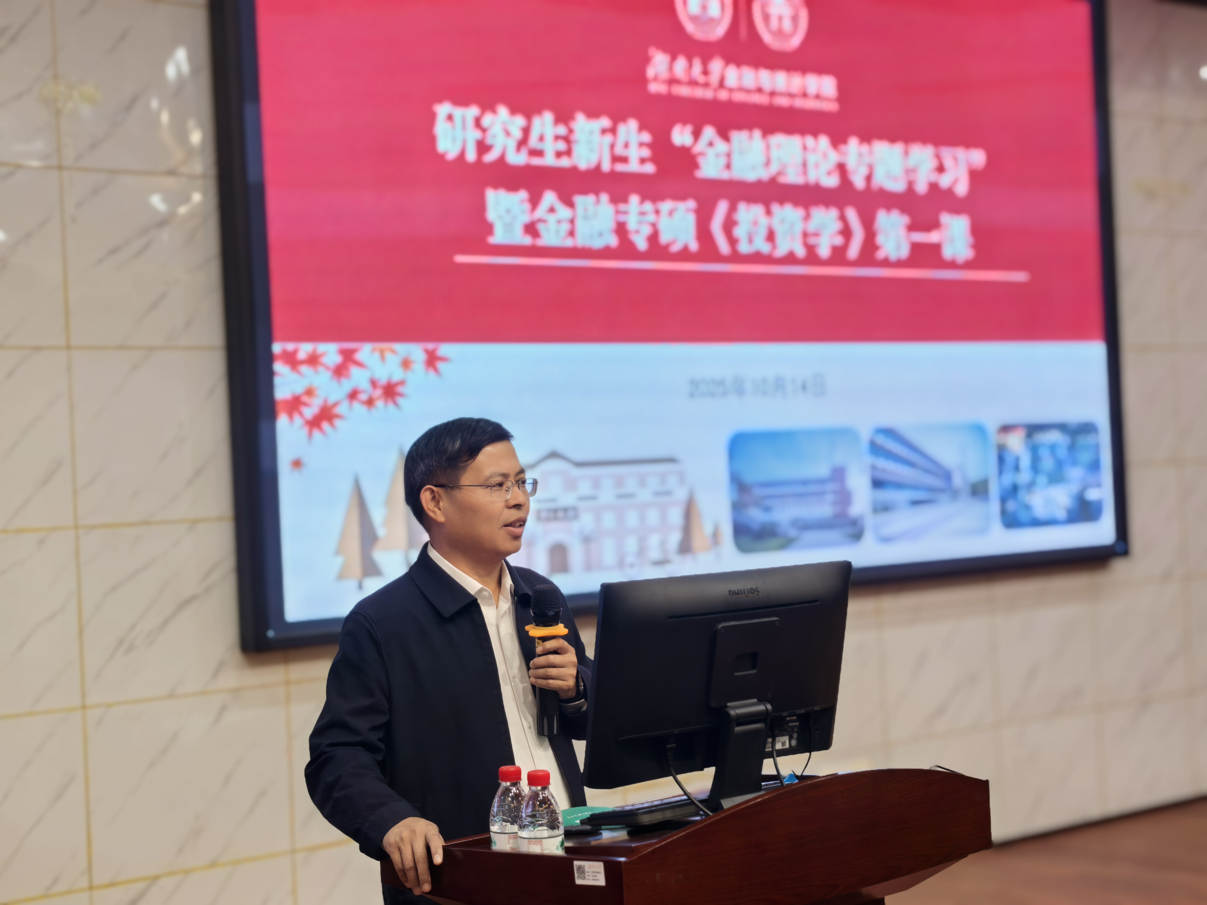 10月14日上午,湖南大学校友、中国证券监督管理委员会原主席肖钢返校交流,主讲研究生《投资学》第一课,作“国际金融热点问题探讨”专题报告。本次授课由金融与统计学院院长王修华教授主持,200余名研究生及教师参会。
