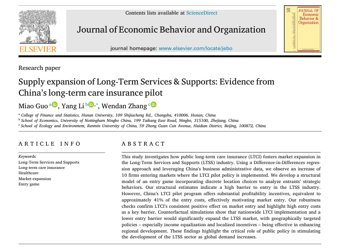 近日,我院保险精算系郭淼副教授合作的论文“Supply expansion of Long-Term Services & Supports: Evidence from China’s long-term care insurance pilot”在院定A2类期刊Journal of Economic Behavior and Organization,volume239,November 2025发表。