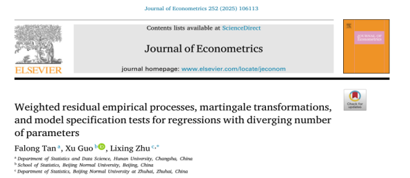 近日,金融与统计学院谭发龙教授在高维统计领域取得研究进展,研究成果以“Weighted residual empirical processes, martingale transformations, and model specification tests for regressions with diverging number of parameters”为题在计量经济学国际期刊Journal of Econometrics在线发表。